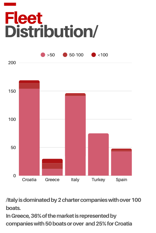• Greece: 36% of the market is controlled by fleets with 50+ yachts