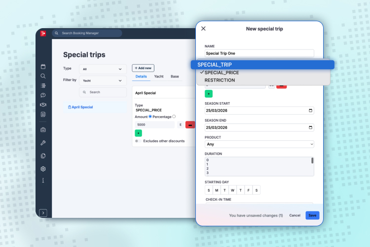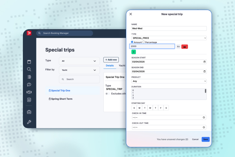 Special Trips allow you to go beyond your standard booking rules. Easily create custom durations like 4, 3, or 2 days and define alternative check-in days such as Tuesday, Wednesday, or Thursday. Perfect for offering midweek or weekend charters. This adjusting your availability without changing your default setup, to promote low season bookings.